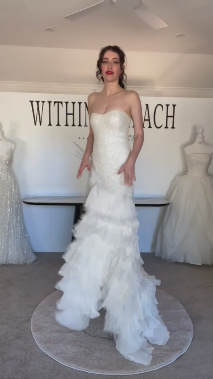 Meticulously hand beaded work of art. Finely boned bodice, with a luxuriously layered soft flowing romantic skirt. Karen Willis Holmes stand out!